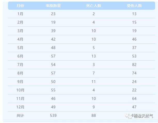 據博燃網平臺收錄統計,2020年全年共計發生燃氣安全事故539起,共造成88人死亡,496人受傷。